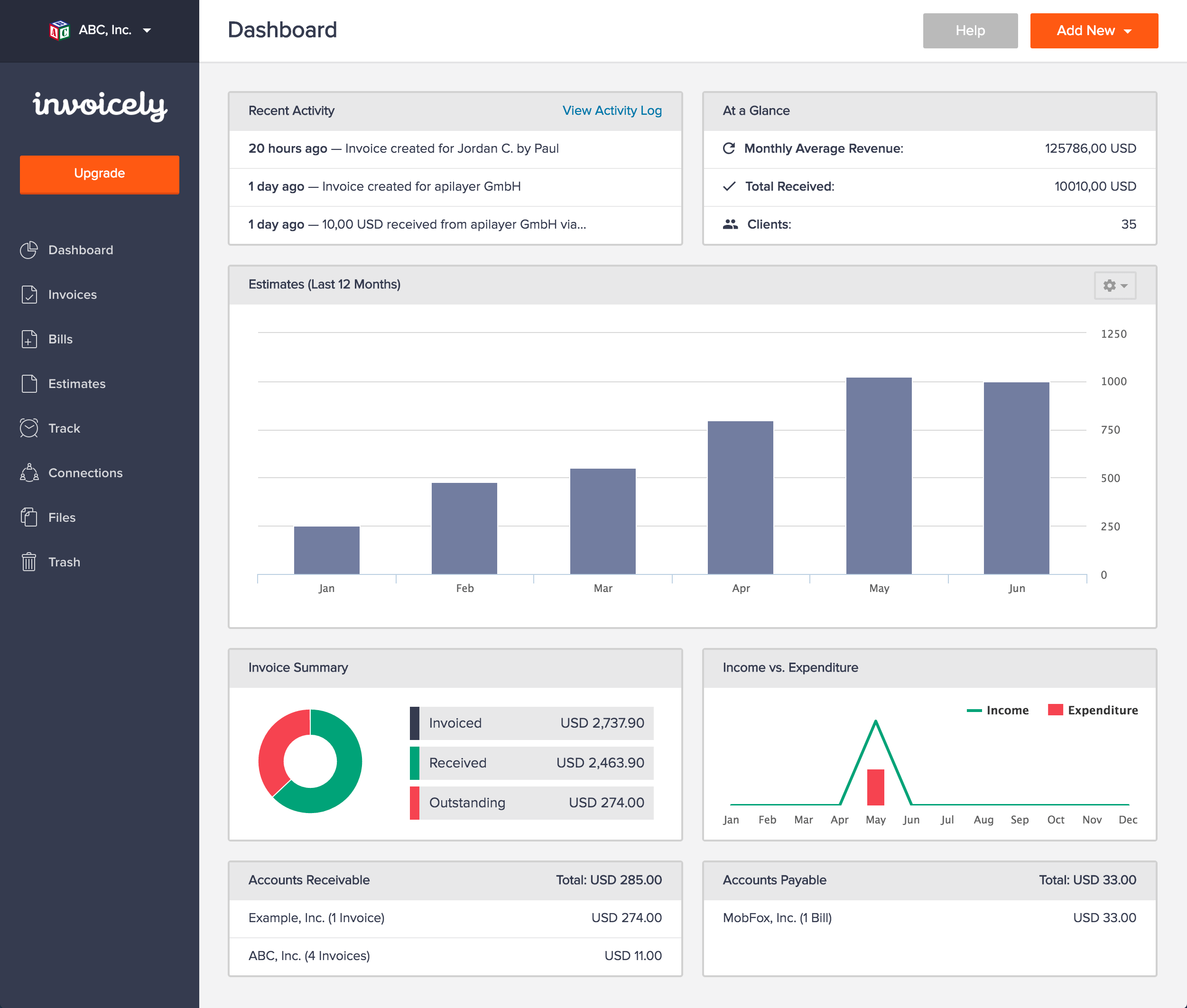Keep track of how much you owe and how much is owed to you by taking a quick look at your Dashboard's Accounts Receivable and Accounts Payable tables.